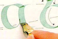 La calligraphie prend forme avec la modulation permanente du trait, dont le plein et le délié peuvent s'obtenir de trois façons : - grâce à la différence entre la largeur d'une plume carrée et son épaisseur : si la plume conserve la même inclinaison, le plein et le délié sont "automatiques" et il est aisé de démarrer, par exemple avec l'écriture de chancellerie ou l'onciale (image extraite d'un livre de D. Harris, pour l'instant éuisé mais qui ressortira un jour) ; - avec la pression exercée sur une plume fine et fendue, c'est le cas de l'anglaise ; - en travaillant le tracé avec des instruments peu habituels, comme le font les calligraphes expérimentés et attirés par la recherche. La plus grande partie des instruments encore disponibles aujourd'hui correspond à la première catégorie ; ils peuvent se présenter sous la forme de plumes, plumes emmanchées, marqueurs, stylos et autres, plus inhabituels.